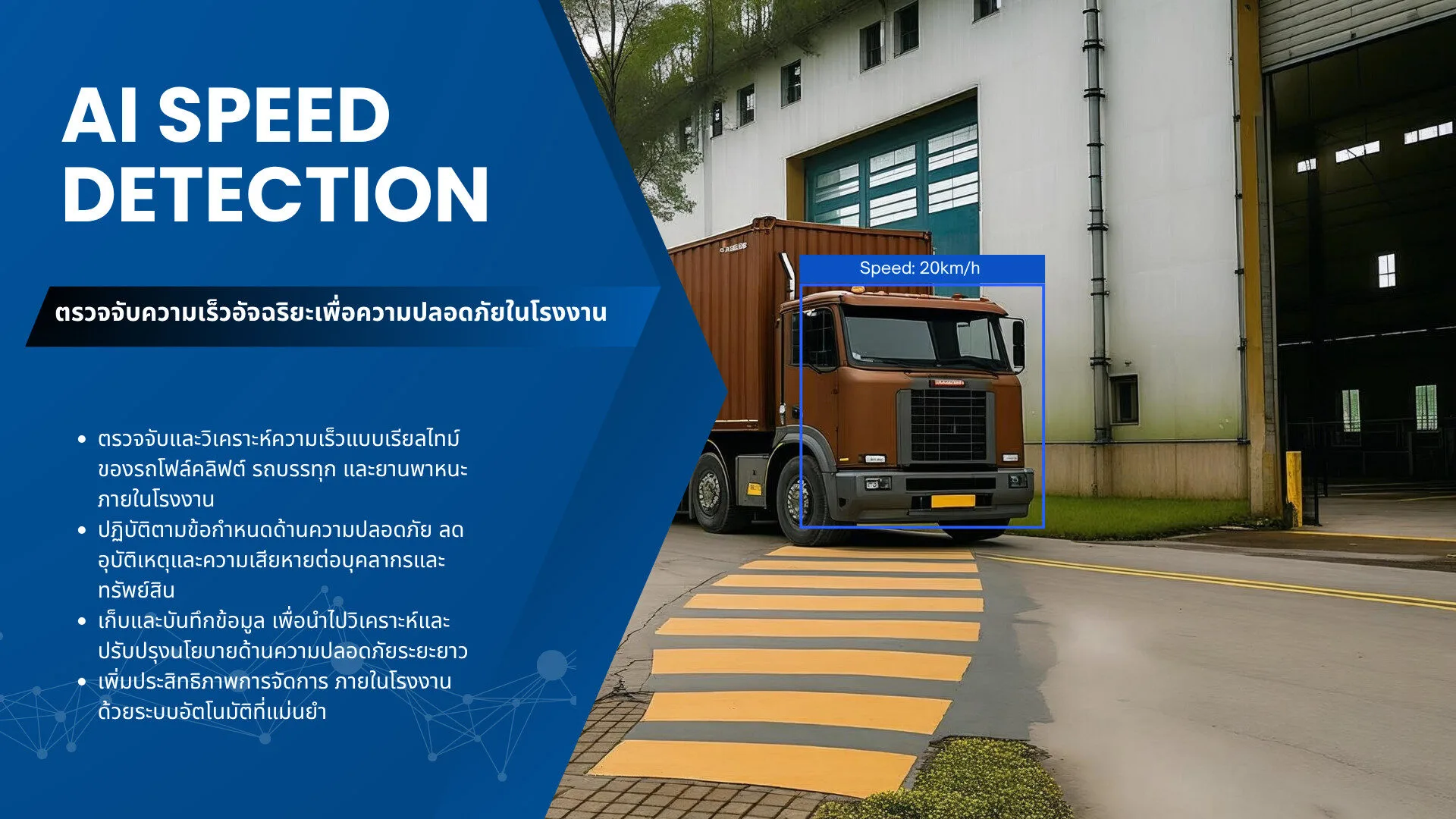 AI Speed Limit Detection: ตรวจสอบความเร็วของเครื่องจักรและยานพาหนะภายในโรงงาน วิเคราะห์ข้อมูลจากเซ็นเซอร์และกล้องเพื่อให้มั่นใจว่าการดำเนินงานอยู่ในขอบเขตปลอดภัย ป้องกันความเสียหายต่อเครื่องจักรและพนักงาน พร้อมปรับปรุงกระบวนการผลิตให้มีประสิทธิภาพสูงสุด