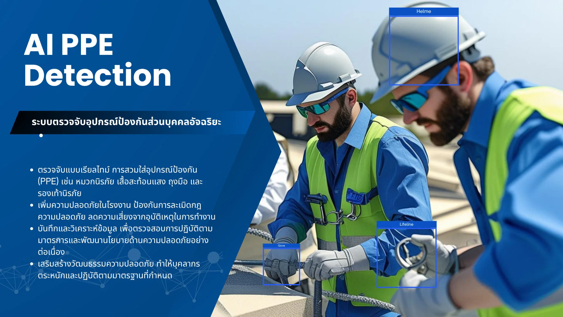 ระบบตรวจจับการสวมใส่อุปกรณ์ป้องกันส่วนบุคคล (PPE) แบบเรียลไทม์ ครอบคลุมหมวกนิรภัย แว่นตา ถุงมือ และเสื้อสะท้อนแสง พร้อมแจ้งเตือนทันทีเมื่อพบการละเมิดมาตรฐานความปลอดภัย ระบบนี้ช่วยลดความเสี่ยงอุบัติเหตุภายในโรงงาน ป้องกันการบาดเจ็บ และสร้างสภาพแวดล้อมการทำงานที่ปลอดภัยและเป็นมาตรฐานเดียวกันในทุกพื้นที่